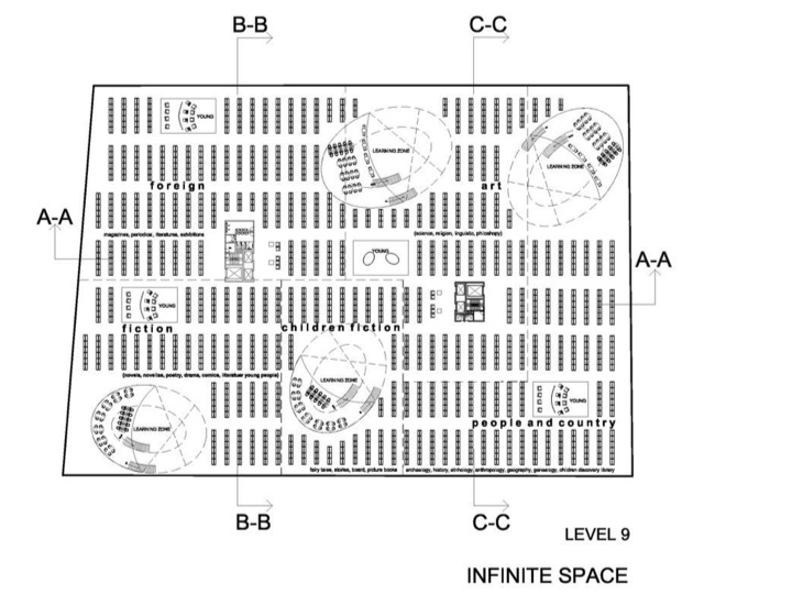 該 pilotis錐透明,讓沿垂直空間體驗之旅的收集面積上層樓。公共區域,需要更多的隱私被放在最高水平。學習區,這要么是閱讀區,或學習領域,是垂直連接到對方。它成為該地區的各種知識交流和不同學科。它也成為該地區預計疲勞在瀏覽整個堆棧。研究對象安排在收集範圍已擴大和重新定位的靈活性,根據各學科的要求。這種靈活性導致一個有力的空間。它的建築銜接的特點是通過使用不同的顏色象徵著其在各樓層的主題。其他的靈活性是在塔外的平台越來越多,如預期的在未來的集合。